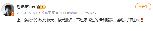 10月15日凌晨配资之家平台,影石CEO刘靖康发文回应微博争议:上一条微博争议比较大,接受批评,不过承诺过的福利照发,感谢批评建议。